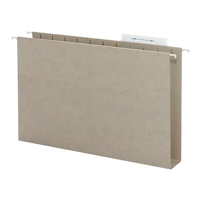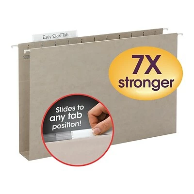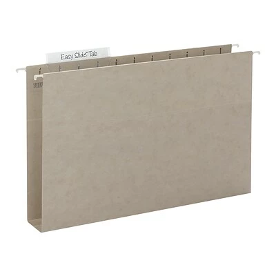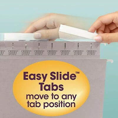Conveniently store reference manuals, catalogs and booklets in these Smead TUFF hanging box bottom folders with Easy Slide Tabs. The reinforced box bottom works well for organizing bulky documents, while the Easy Slide plastic tabs make labeling files easy. Made of heavy-duty 14-point paper stock for durability, these folders feature special reinforcement rods to resist bending when positioned in storage bins.