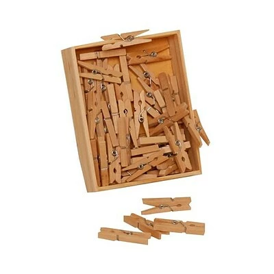 JAM Paper® Medium Natural Wood Clothing Pin Clips are sold in wooden boxes of 50! Each pin measures 1 1/8 inches and is made of wood with a metal spring mechanism. Unpainted, these clothing style pins feature a classic natural brown wood color. Versatile and lightweight, these pins are great for fastening photos, memos, receipts, cash, small pieces of fabric, and other small items to surfaces or string. Providing a light amount of pressure, there clips and be easily removed and reattached. Use these pins in your home or office! They are ideal for many crafts, organization projects, decorations, attached notes to party favors, and much more!