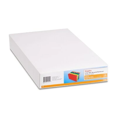 Keep documents grouped together securely with these hanging file folders. Coated hooks and heavyweight paper construction help extend the life of your files, while the thoughtful sizing accommodates legal-size documents to protect against loss and damage. A repositionable five-tab layout lets you create a custom labeling system. With an assortment of hues in each pack, these Staples Business Essentials legal-size reinforced hanging file folders let you color-code pages for an added layer of organization.