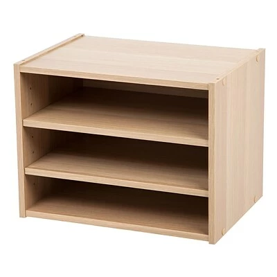 Style your storage around your space with our versatile stacking boxes. Stack up to three boxes vertically to triple your storage and keep clutter contained. Organize and stow papers, files, office supplies and more, anywhere in the house. With six available styles in two complementary wood-grain colors, it’s easy to create a customized design to suit all your storage needs. Some Assembly Required. Shelves are 0.5″ Thick, Inner Dimensions = 14.75″ W x 10.75″ D x 10.75″ H (without shelves). With shelves attached, inner height varies with shelf placement. Weight Capacity: 8 pounds per shelf, 22 pounds each top and bottom board.