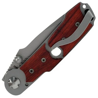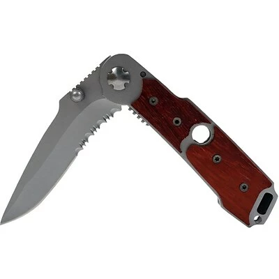 Trademark Whetstone™ 6 1/2″ Deluxe folding Knife with wood handle features liner lock blade locking design helps to use safely. Knife comes with partially serrated blade for durability.