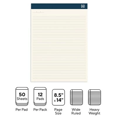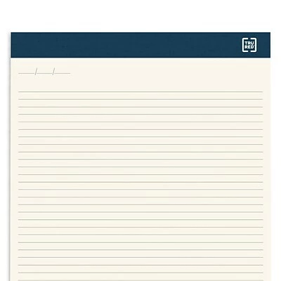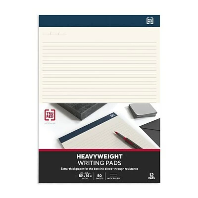 Flip through pages to review notes taken on these perforated pad. The wide ruled lines support legible writing on the 20-pound paperweight surface, while the top-bound design lets you easily turn to a new page. Featuring a perforated design, this notepad lets you tear pages so you can share notes with team members. These TRU RED⢠8.5 x 14-inch ivory heavyweight pads features a laminated backer with a matching header for a clean, professional look.